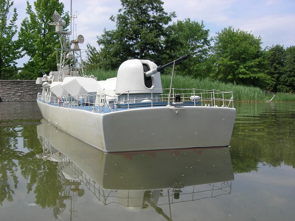 Mein Modell ist nach drei Jahren Bauzeit seit 1993 in Betrieb, das Bauset im Maßstab 1:30 wurde noch von der Firma Schaffer hergestellt. Damals kostete mich das Modell inkl. Fernbedienung über 3000 DM. Schaffer gibt es mittlerweile nicht mehr, viele Modelle, auch die Reshef, sind jetzt bei Hasse in Hamburg erhältlich. Von der von Schaffer abgelieferten Qualität bin ich im Nachhinein unzufrieden. Der Aufbau ist extrem dickwandig, was die Topplastigkeit des Modells verstärkt. Die Harzgussteile des Beschlagsatzes sind aus einem Material, das bisher bei allen Lackierversuchen irgendwannn zu Verfärbungen führte. Aber vor allem erwies sich die Dokumentation an vielen Stellen als falsch. Damals standen nur die Baupläne und ein paar Fotos eines "Urmodells"zur Verfügung, Internet gab es damals noch nicht. Mittlerweile fand ich heraus, daß u.a. der Mast spiegelverkehrt ist, die Kuppeln der OTO-Melaras eine falsche Bauform haben, und die 20 mm-Flaks scheinen in ihrer Form reine Phantasie zu sein, um nur die gröbsten Schnitzer zu nennen.