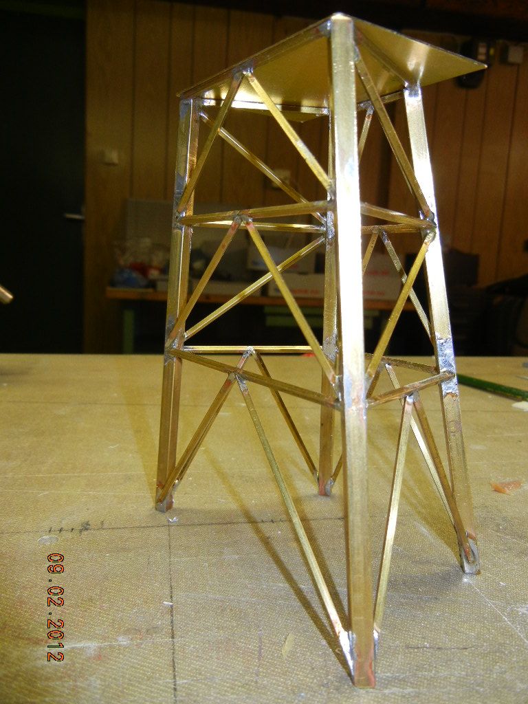 Irgendwann fiel mir auf den bis dahin vorliegenden Fotos auf, daß die Pfosten des Turmmastes gerade Flächen haben...? Nach intensiver Betrachtung: Sie haben Ecken. Winkelprofile? Jedenfalls keine Rundrohre! Später fand ich eine Nahaufnahme: Der Turmmast besteht aus Vierkantrohren, auch die Streben! Toll. Macht Modulor wieder mehr Umsatz und die Sache durch die Schrägen nicht leichter. Nach etwa acht Stunden war der untere Bereich im Rohbau fertig: